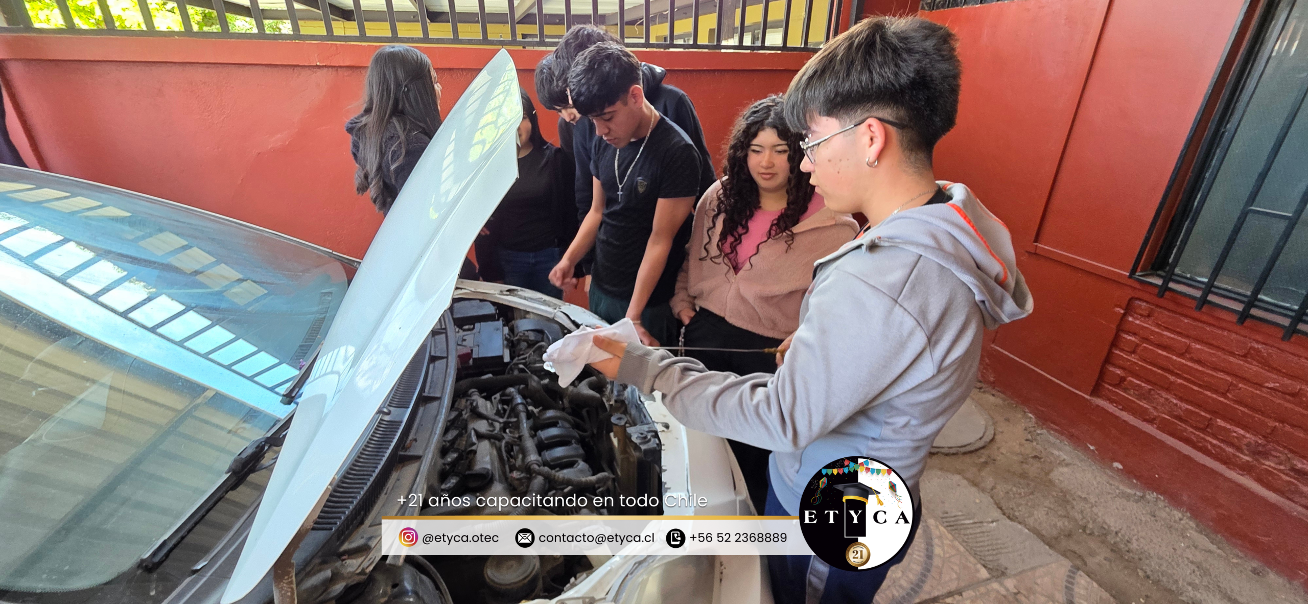 El curso “Técnicas de Prevención Vehicular”, dirigido a estudiantes del Liceo Tecnológico de Copiapó, continúa su desarrollo con una jornada práctica de mecánica automotriz realizada en las dependencias del Instituto ETYCA.